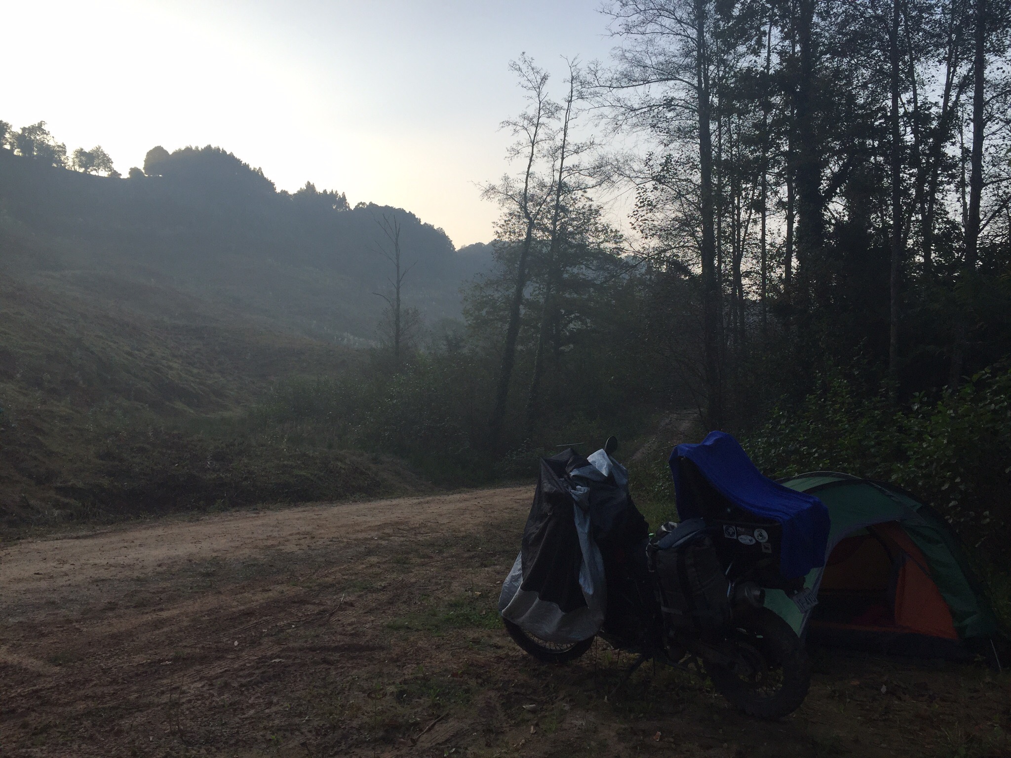 It was getting late and had been a long day so I started looking for a campsite which wasn’t easy to find with the steep cliffs on one side and the river on the other and the only green areas were in the Villages. I eventually found a spot behind some trees on the side of the road, not ideal but the wind had whipped up and it looked like a storm was on the way.